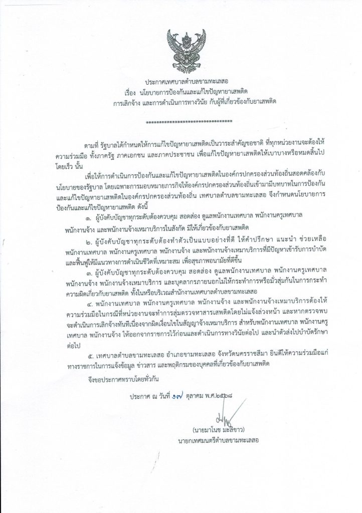 ประกาศเทศบาลตำบลขามทะเลสอ เรื่อง นโยบายการป้องกันและแก้ไขปัญหายาเสพติด การเลิกจ้าง และการดำเนินการทางวินัย กับผู้ที่เกี่ยวข้องกับยาเสพติด 22 ต.ค. 68 แชร์