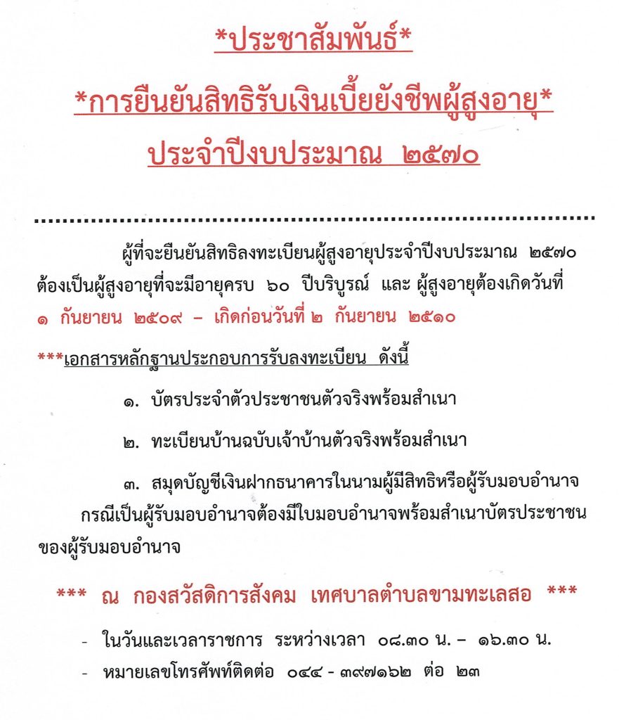 ประชาสัมพันธ์ การยืนยันสิทธิรับเงินเบี้ยยังชีพผู้สูงอายุ ประจำปีงบประมาณ 2570 รายละเอียดตามเอกสารที่แนบมาพร้อมนี้ 24 ต.ค. 68 แชร์