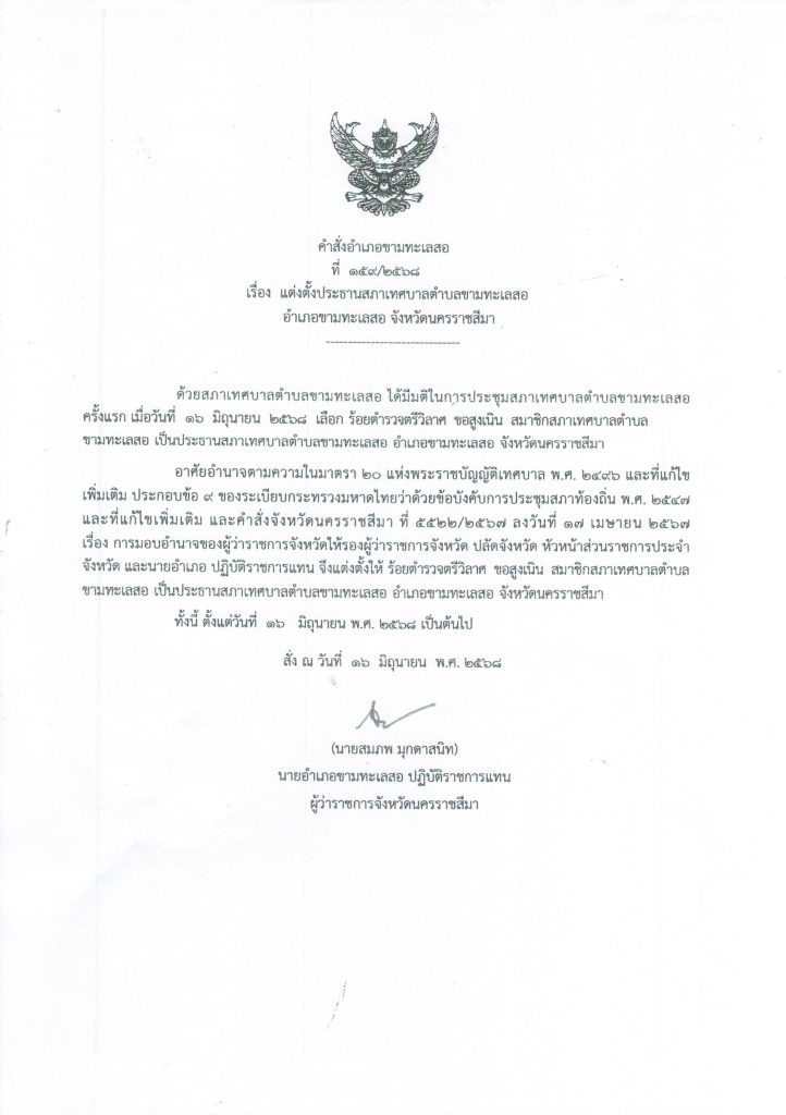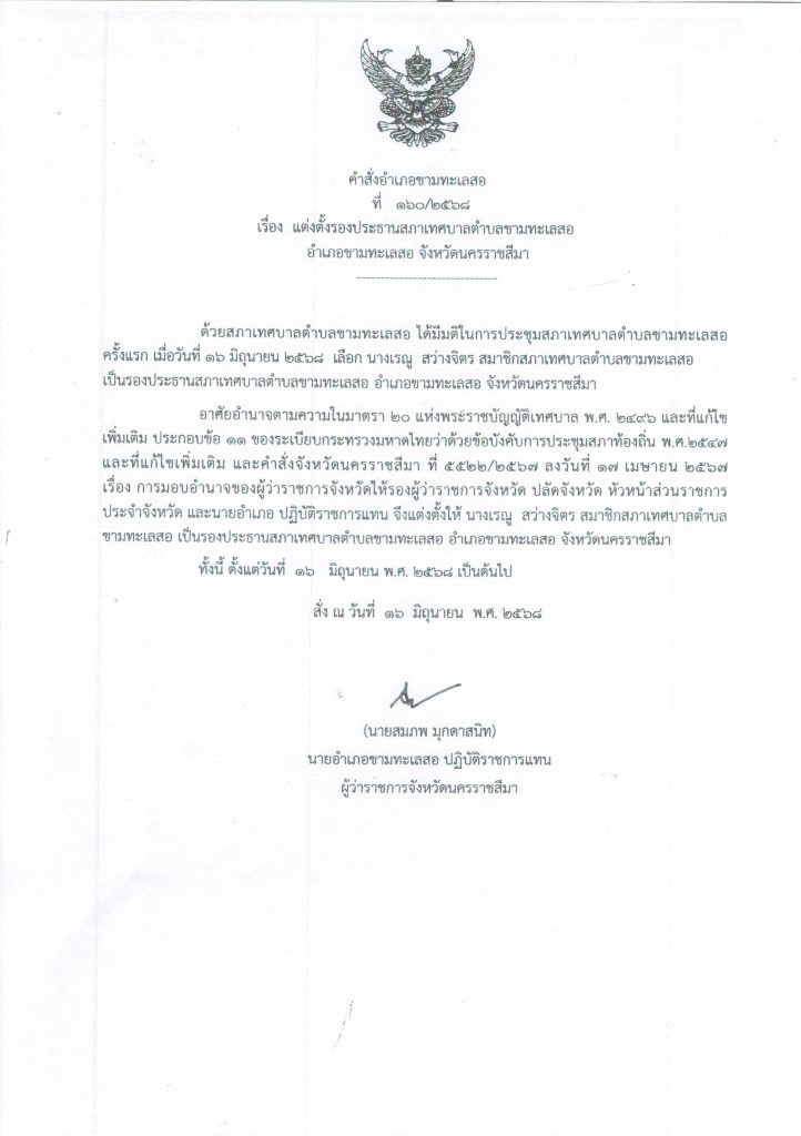 ประชาสัมพันธ์….คำสั่งแต่งตั้งประธานสภาเทศบาลตำบลขามทะเลสอและรองประธานสภาเทศบาลตำบลขามทะเลสอ โดยมีรายละเอียดดังนี้