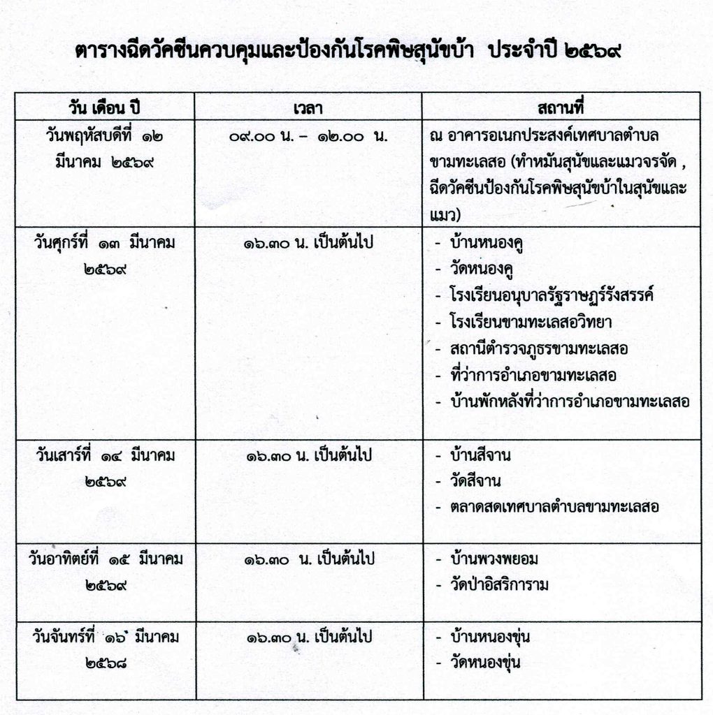 !!!ประชาสัมพันธ์!!! ด้วยกองสาธารณสุขและสิ่งแวดล้อม เทศบาลตำบลขามทะเลสอ จะดำเนินโครงการสัตว์ปลอดโรคคนปลอดภัยจากโรคพิษสุนัขบ้าฯ ประจำปีงบประมาณ พ.ศ.2569 โดยมีการให้บริการฉีดวัคซีนป้องกันโรคพิษสุนัขบ้า และการทำหมันสุนัขและแมวจรจรจัด โดยไม่เสียค่าธรรมเนียมให้แก่สัตว์เลี้ยง (สุนัขและแมว) ของประชาชนในเขตเทศบาลตำบลขามทะเลสอ รายละเอียดตามเอกสารที่แนบมาพร้อมนี้