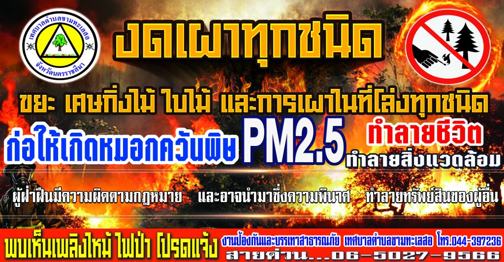 ประชาสัมพันธ์…..เทศบาลตำบลขามทะเลสอ ขอเป็นส่วนหนึ่งในการร่วมรณรงค์ งดเผาทุกชนิด ลดหมอกควัน เราทุกคนช่วยได้ เช่น ขยะ เศษกิ่งไม้ ใบไม้ และการเผาที่โล่งทุกชนิด เพื่อรักษาสิ่งแวดล้อม สุขภาพของประชาชนและสภาพเศรษฐกิจโดยรวมของประเทศไทย ด้วยความห่วงใยจากเทศบาลตำบลขามทะเลสอ