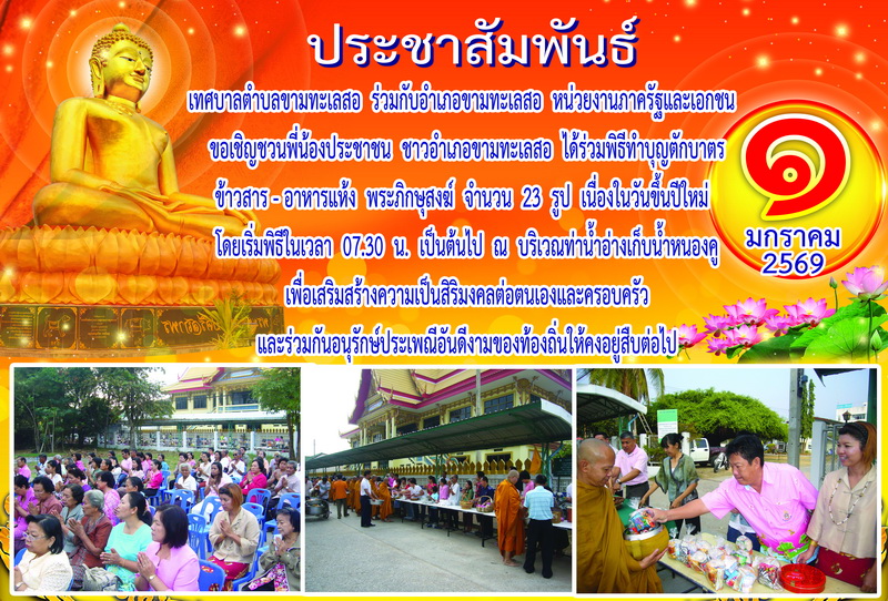เทศบาลตำบลขามทะเลสอ ร่วมกับอำเภอขามทะเลสอ หน่วยงานภาครัฐและเอกชน ขอเชิญชวนพี่น้องประชาชนชาวอำเภอขามทะเลสอ ได้ร่วมพิธีทำบุญตักบาตรข้าวสาร – อาหารแห้ง พระภิกษุสงฆ์ จำนวน 23 รูป เนื่องในวันขึ้นปีใหม่ วันพฤหัสบดีที่ 1 มกราคม 2569 โดยเริ่มพิธีในเวลา 07.30 น. เป็นต้นไป ณ บริเวณท่าน้ำอ่างเก็บน้ำหนองคู เพื่อเสริมสร้างความเป็นสิริมงคลต่อตนเองและครอบครัว และร่วมกันอนุรักษ์ประเพณีอันดีงามของท้องถิ่นให้คงอยู่สืบต่อ